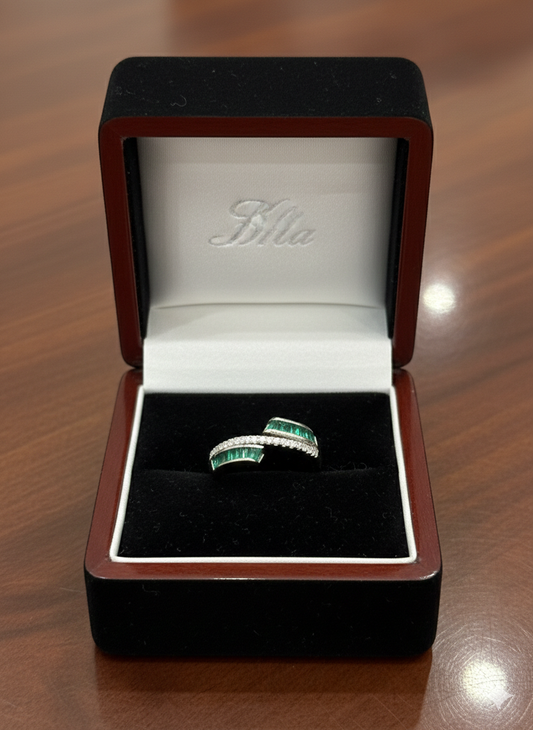 Emerald & Diamond Bypass Wrap Ring in 925 silver