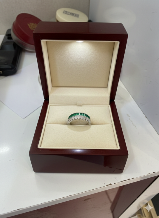 Sterling Silver Emerald & Diamond Simulant Alternating Baguette Eternity Ring