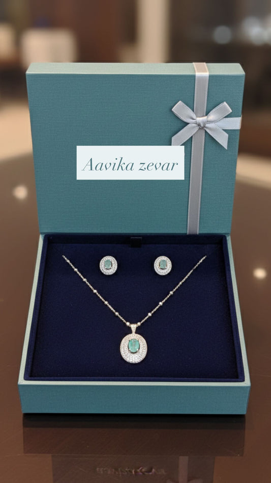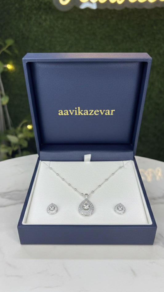 Aavikazevar 925 Sterling Silver oval Pendant Necklace with Matching Stud Earrings | Cubic Zirconia Diamond-Look Jewellery Set for Women & Girls