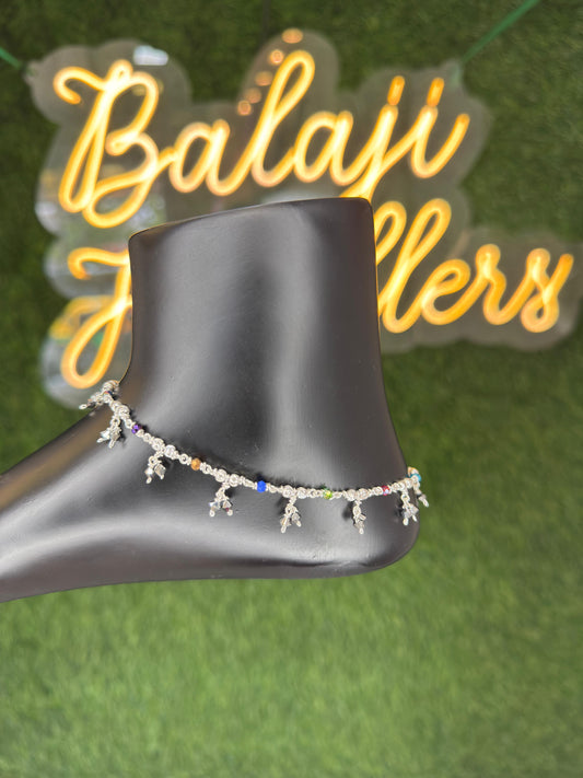 Silver Anklet with Multicolor Beads & Hanging Charms – Lightweight Daily Wear Payal for Women & Girls