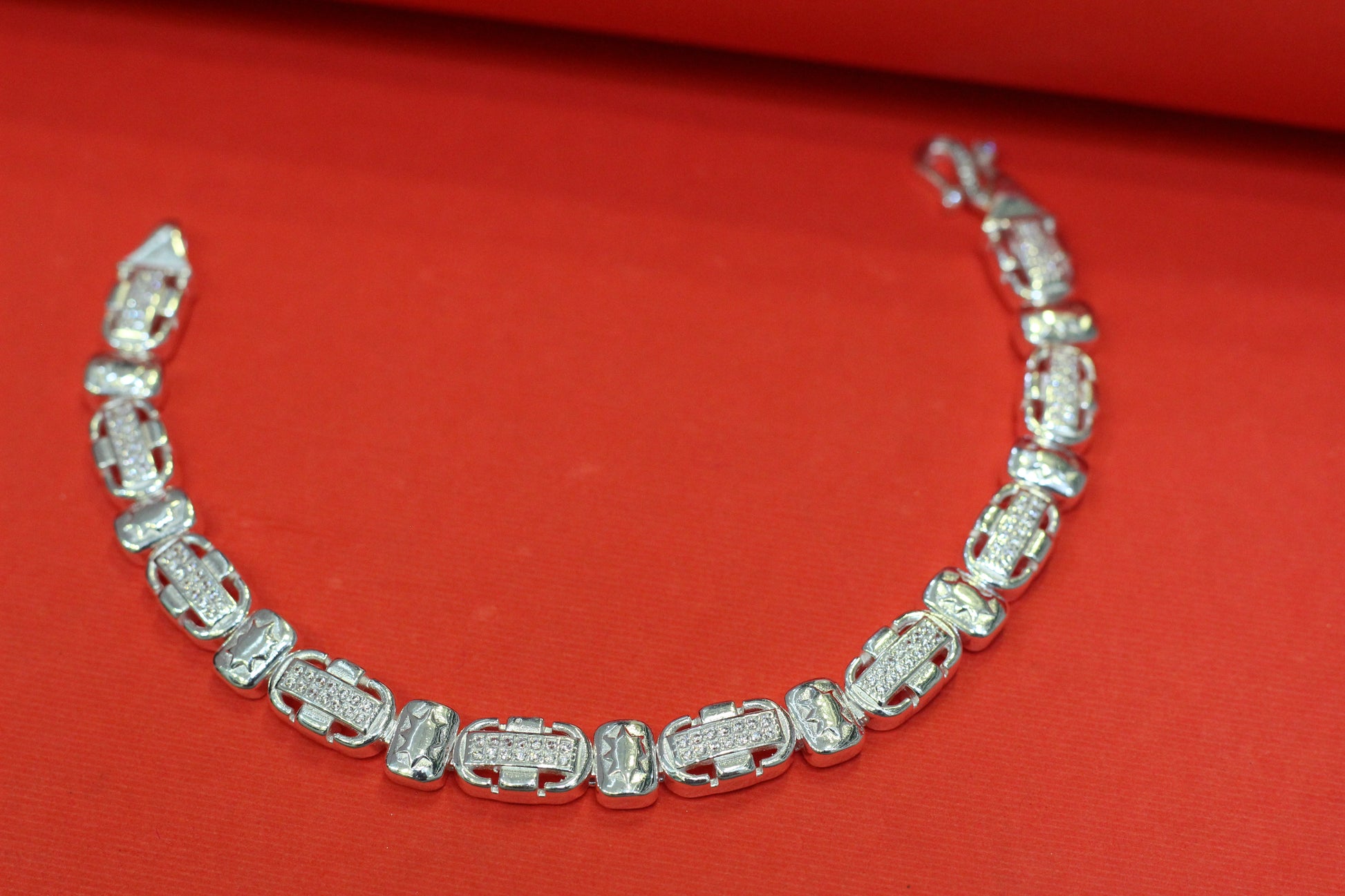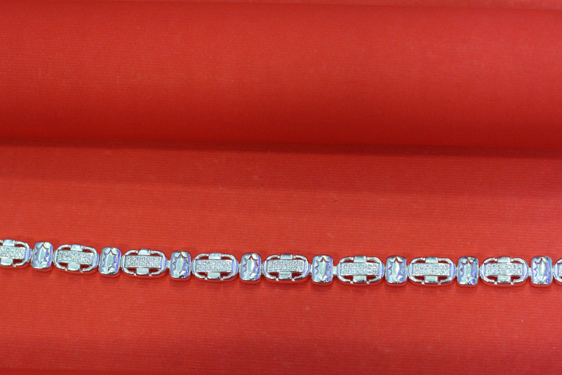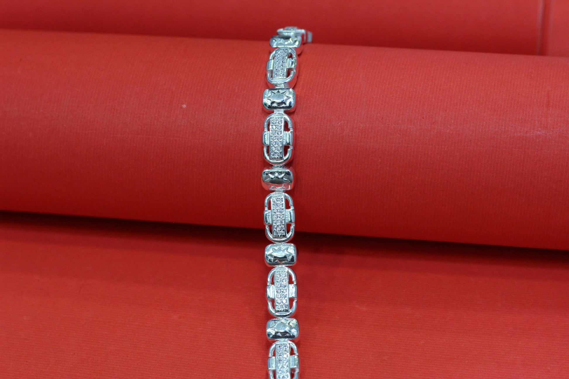 Add timeless sophistication to your style with this exquisite bracelet. Crafted with precision, it features alternating links of sparkling textured metal and micro-paved cubic zirconia stones, creating a perfect balance of shine and elegance. The rectangular and cushion-shaped links are intricately designed, giving the bracelet a luxurious and modern appeal.