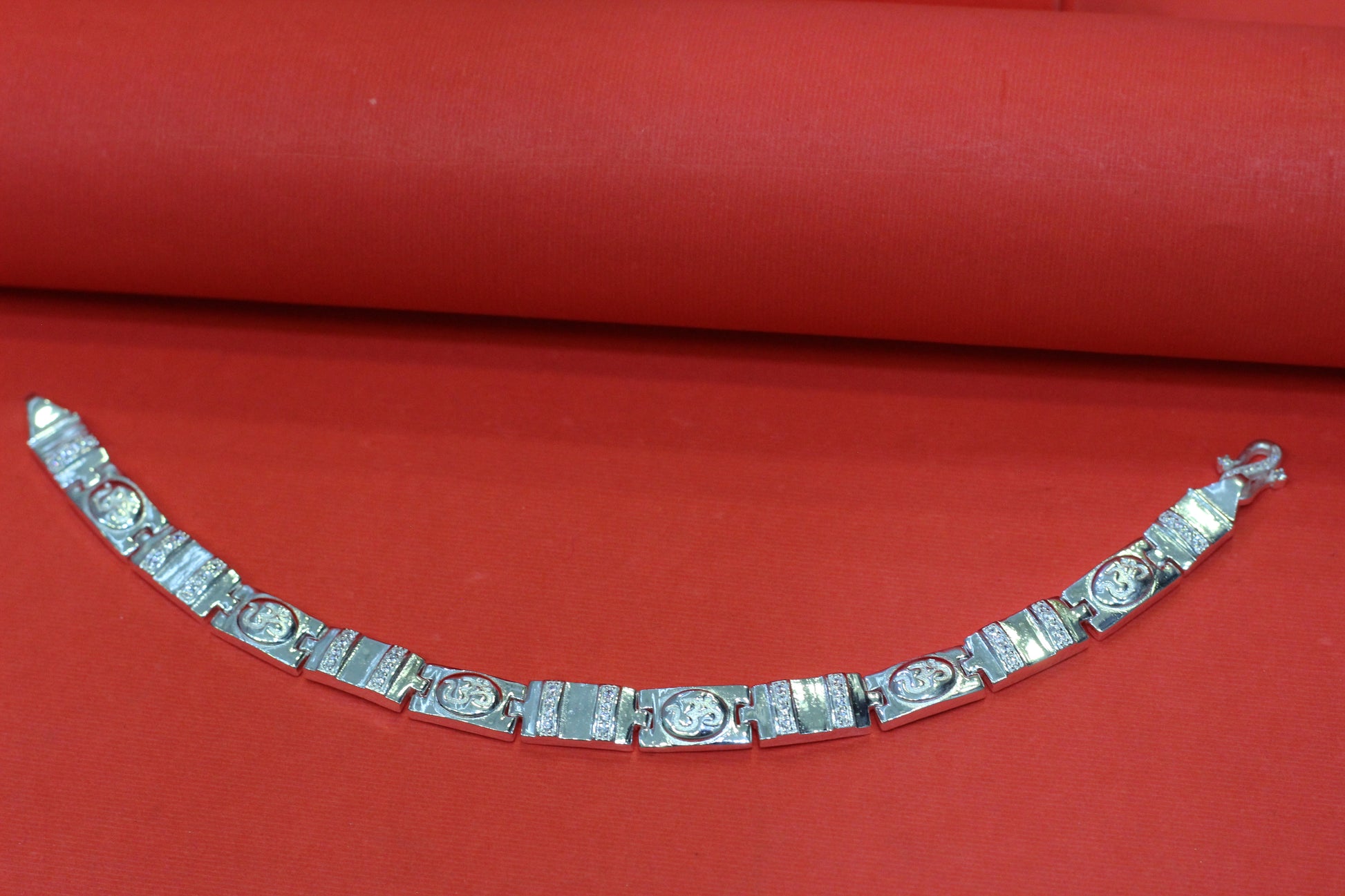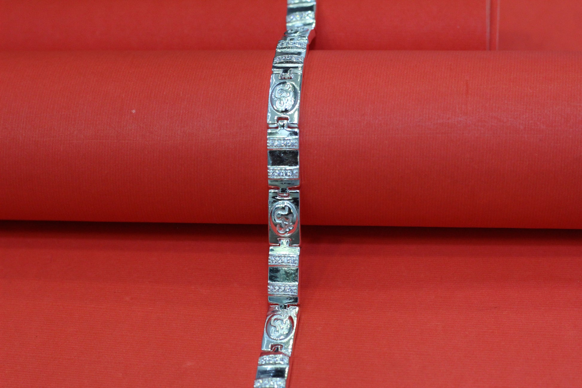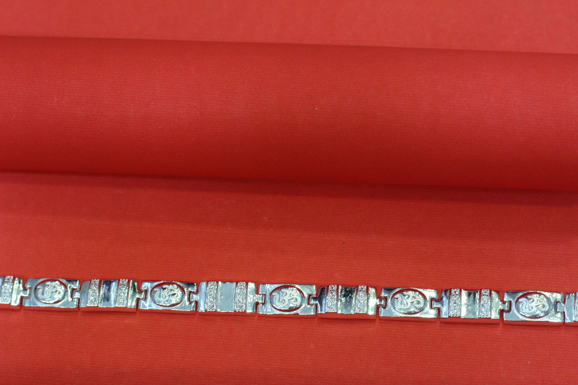 Design Details: Alternating engraved Om symbols & textured rectangular links