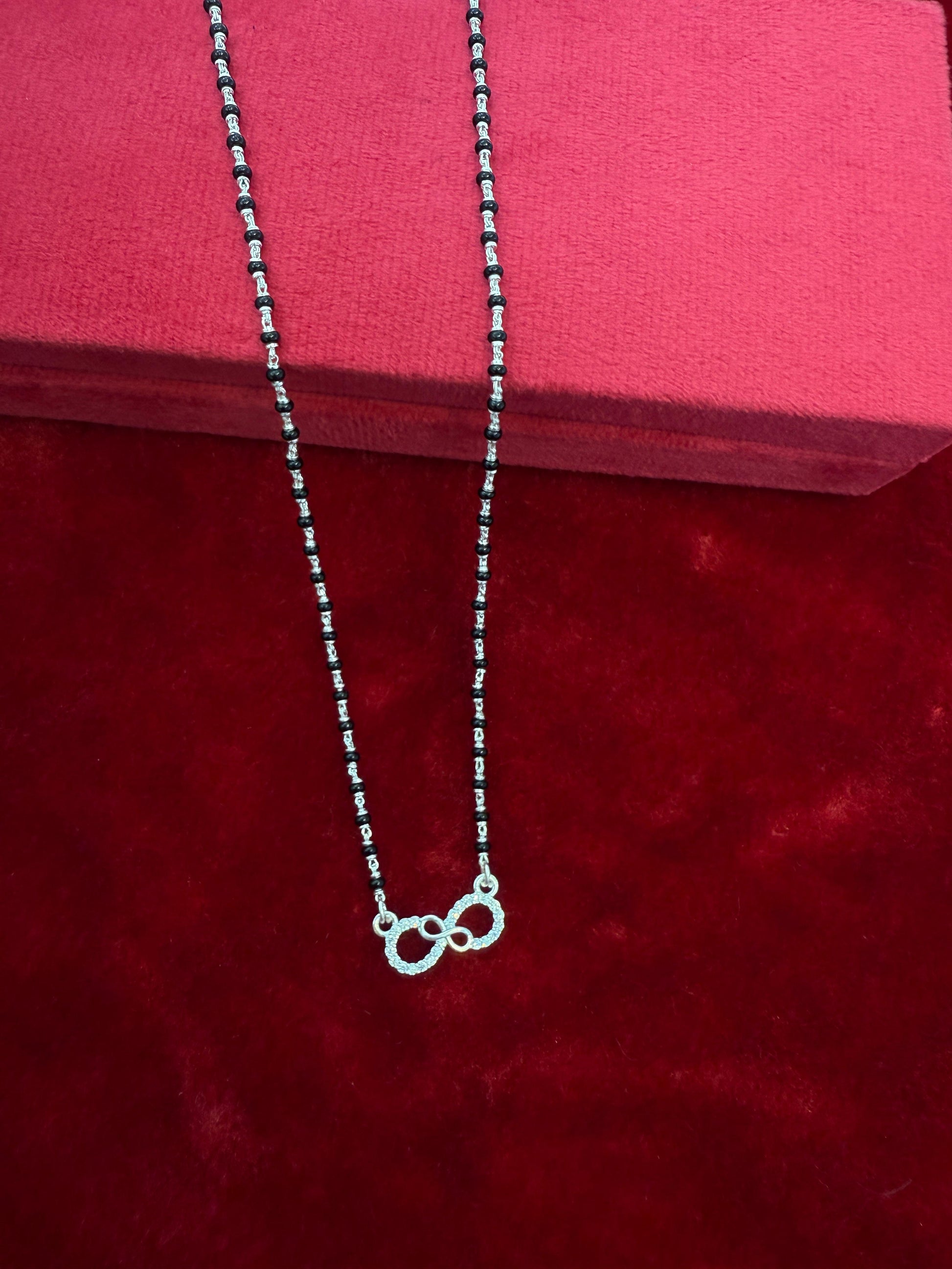 Celebrate your bond with this beautifully handcrafted silver mangalsutra with infinity pendant . The fine silver detailing and classic bead arrangement make it a perfect blend of tradition and modern craftsmanship.