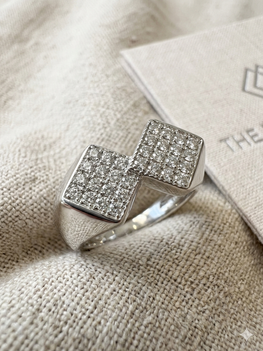 Elevate your style with this modern geometric masterpiece. Crafted from high-quality 925 Sterling Silver, this ring features two interlocking rhombus motifs meticulously pavé-set with shimmering Cubic Zirconia. The bold, wide band offers a comfortable fit while making a sophisticated statement. Perfect for daily wear or special evening occasions.