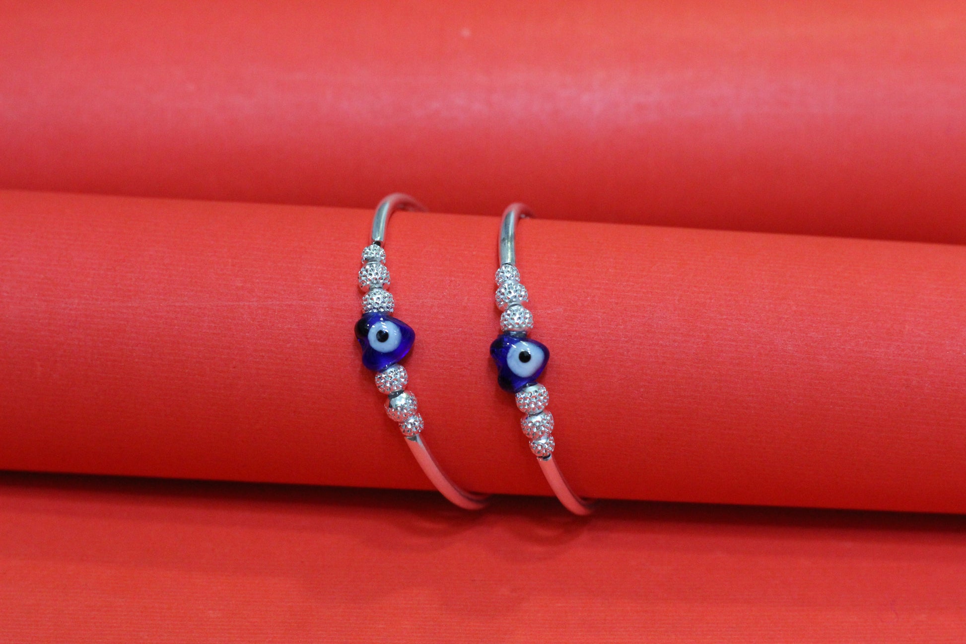 Protect your little one with these beautifully crafted Silver Nazariya Bangles, designed especially for kids. Each bangle features a traditional blue evil eye bead at the center, believed to ward off negativity and bring good luck. The combination of sleek silver beads and detailing adds a touch of elegance, making it perfect for daily wear or gifting.